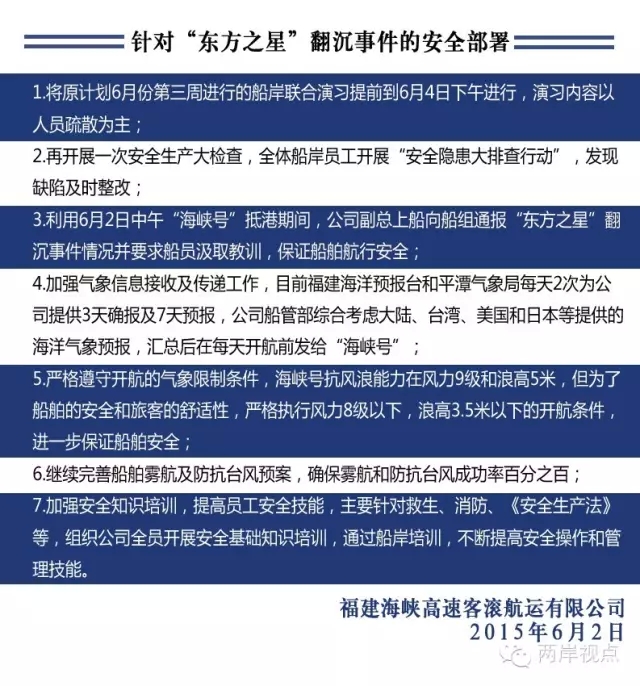 在实现“三通”之后,每天有许多航船往来于海峡两岸之间,其中最为著名的,无疑是执行两岸客运通航的“海峡号”与“丽娜轮”。为了回答关于两岸海上客运航行安全的问题,两岸视点专门采访了“海峡号”运营方——福建海峡高速客运有限公司的董斌总经理,得知他们针对“东方之星”事故,已经迅速做出部署,加强了安全保障措施,提升了事故预防等级,并于6月4日下午开展了船岸联动应急演习。