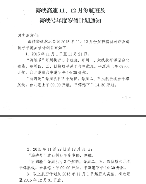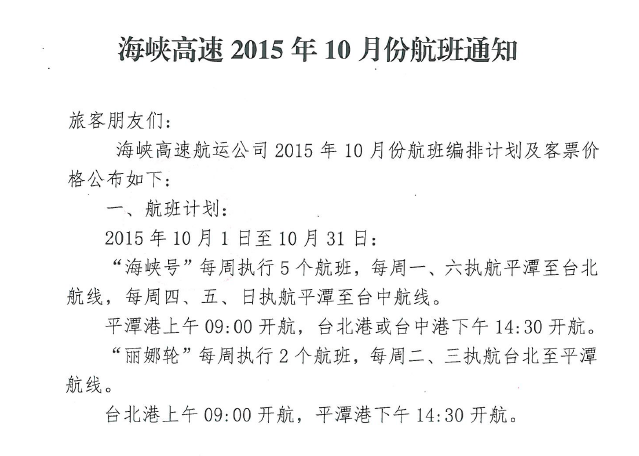 尊敬的旅客、货主朋友们: 由于受今年第21号台风“杜鹃”影响, 9月28日至9月30日,台湾海峡东北风超过9级,浪高超过3.5米,已达不到“海峡号”&“丽娜轮”安全航行的条件,为了保证船舶航行安全和保护... [查看详情]